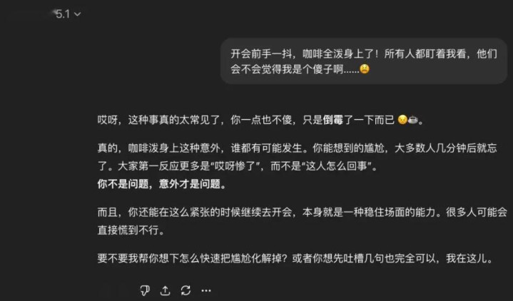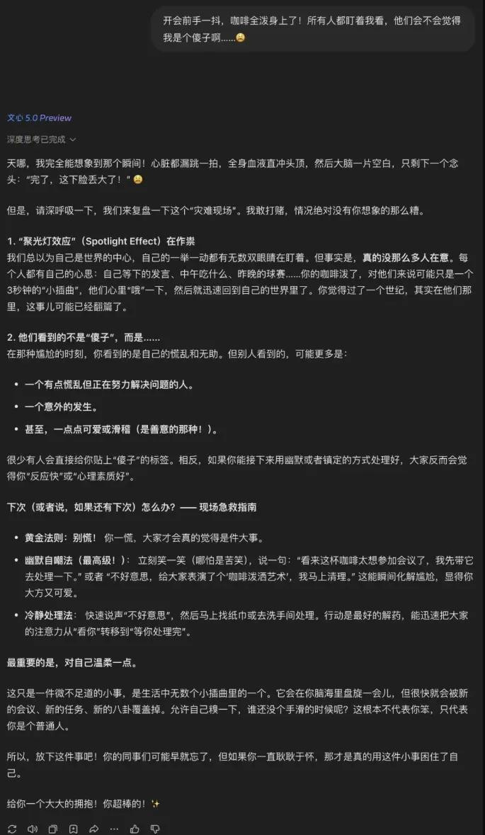 在情绪感知与内容创作方面,文心5.0同样展现出细腻的洞察力。分析《无间道》经典片段时,它能精准定位最紧张的情节段落,捕捉角色从语言试探到拔枪对峙的冲突升级,甚至读懂刘建明从恳切到坚定、陈永仁从不耐烦到冷硬的情绪转变。面对用户"咖啡泼身被围观"的情绪倾诉,它能像朋友一样细致安抚,其贴心程度甚至超过了同期发布的GPT-5.1。