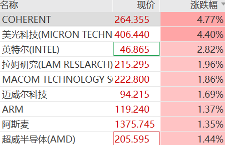 美股科技股走强,存储概念盘初集体上涨,Coherent涨近5%,美光科技、西部数据涨超4%,英特尔、闪迪涨约3%。存储芯片涨价或贯穿2026全年,OPPO、小米、苹果、三星、戴尔等全面涨价。